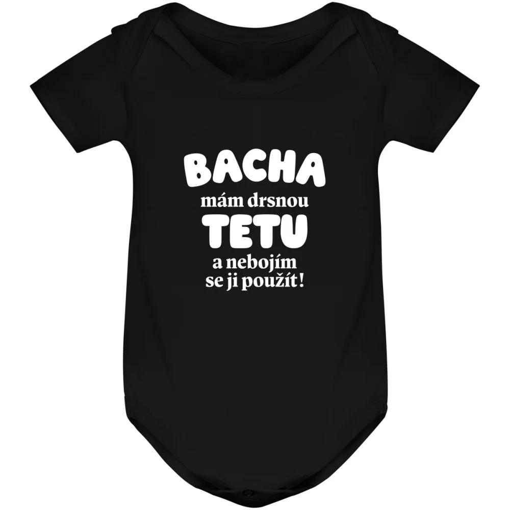 Kojenecké body s potiskem „Bacha na mou tetu!“ je skvělý a vtipný dárek od tety pro miminko. Nápis „Bacha, mám drsnou tetu a nebojím se jí použít!“ zaručeně pobaví a dá jasně najevo, kdo je v rodině ten největší ochránce. Potisk je vyroben moderní DTF technologií, která vydrží i časté praní a neztrácí barvy.