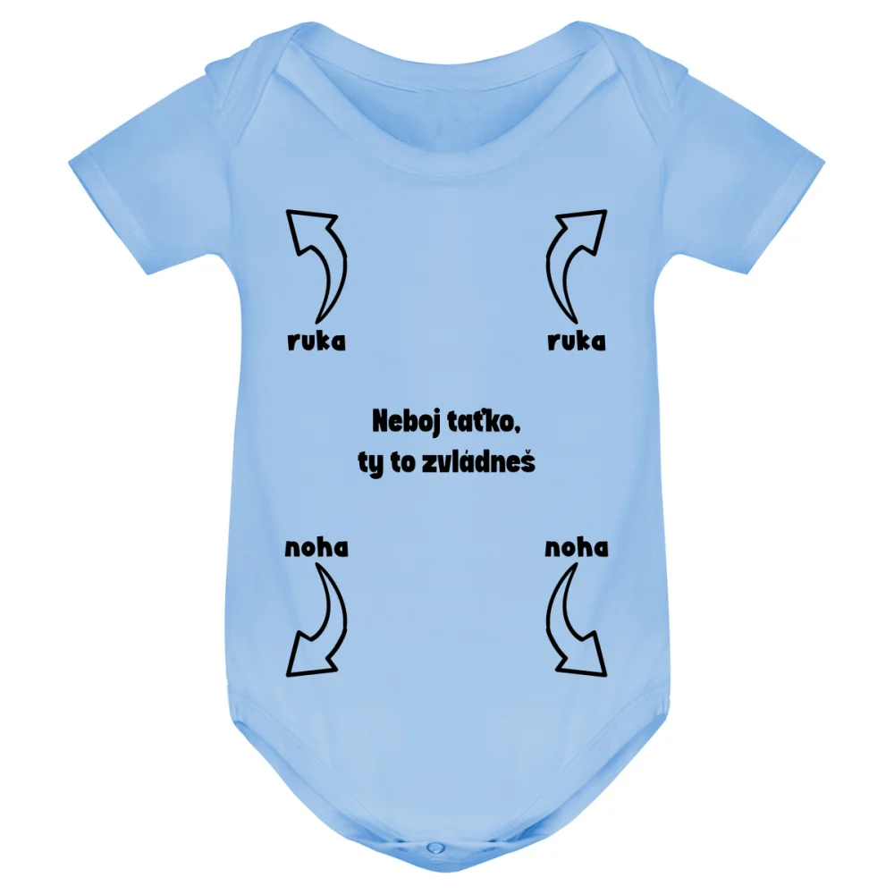 Kojenecké body s potiskem „Neboj taťko, ty to zvládneš“ je vtipný kousek, který ukáže, že i tatínek si poradí s přebalováním. Potisk se šipkami a popisky (ruce, nohy…) pobaví každého a dělá z bodyčka skvělý dárek pro novopečeného otce. Potisk je proveden moderní DTF technologií, která vydrží i časté praní a neztrácí barvy.