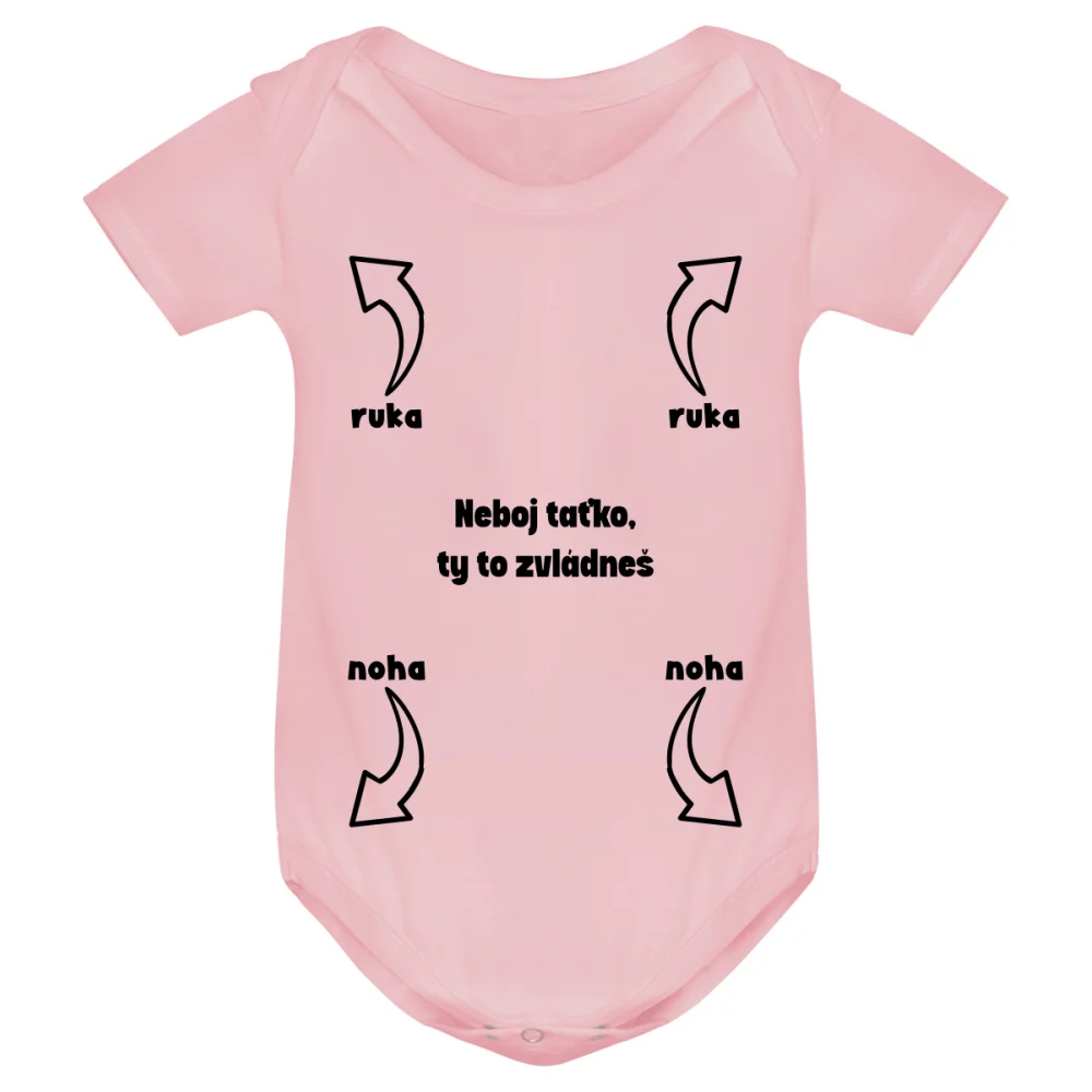 Kojenecké body s potiskem „Neboj taťko, ty to zvládneš“ je vtipný kousek, který ukáže, že i tatínek si poradí s přebalováním. Potisk se šipkami a popisky (ruce, nohy…) pobaví každého a dělá z bodyčka skvělý dárek pro novopečeného otce. Potisk je proveden moderní DTF technologií, která vydrží i časté praní a neztrácí barvy.