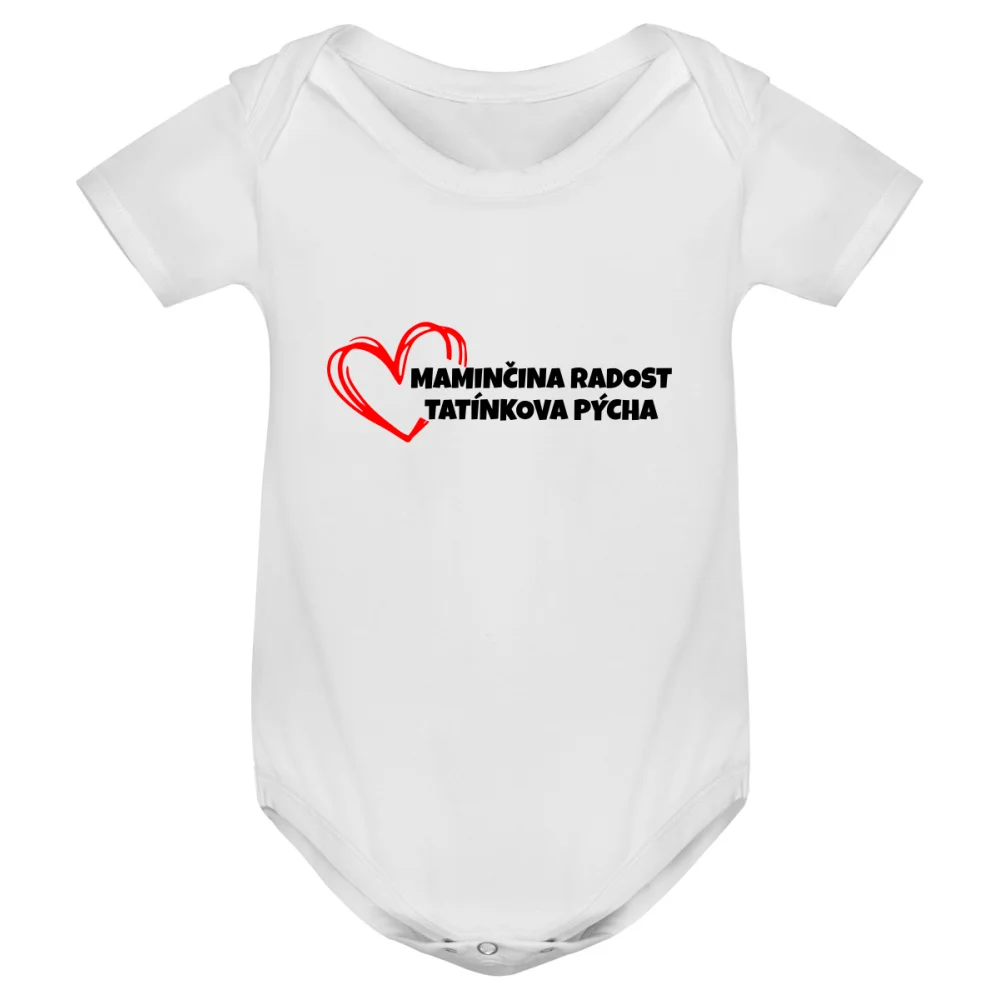 Kojenecké body s potiskem „Maminčina radost, tatínkova pýcha“ je roztomilý kousek, který vyjádří lásku celé rodiny. Ideální dárek pro novopečené rodiče i jako originální outfit pro miminko. Kvalitní DTF potisk vydrží časté praní a zůstává krásně sytý.