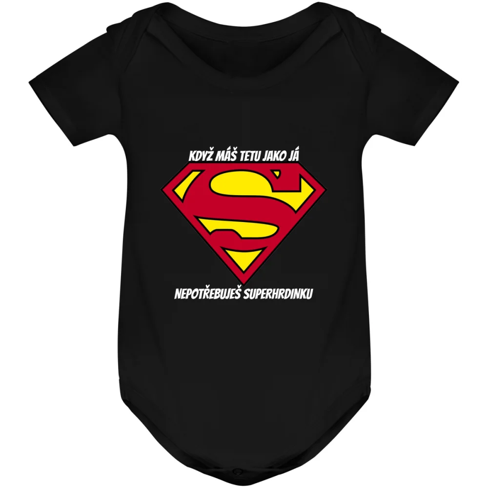 Kojenecké body s potiskem „TETA SUPERHRDINKA (KDYŽ MÁŠ TETU JAKO JÁ, NEPOTŘEBUJEŠ SUPERHRDINKU)“ je vtipný a originální dárek, který podtrhne speciální pouto mezi tetou a jejím malým špuntem. Roztomilý a hravý motiv pobaví rodinu i přátele a stane se oblíbeným kouskem v šatníku miminka. Potisk je vyroben kvalitní DTF technologií, takže vydrží časté praní a zůstane dlouho krásný.