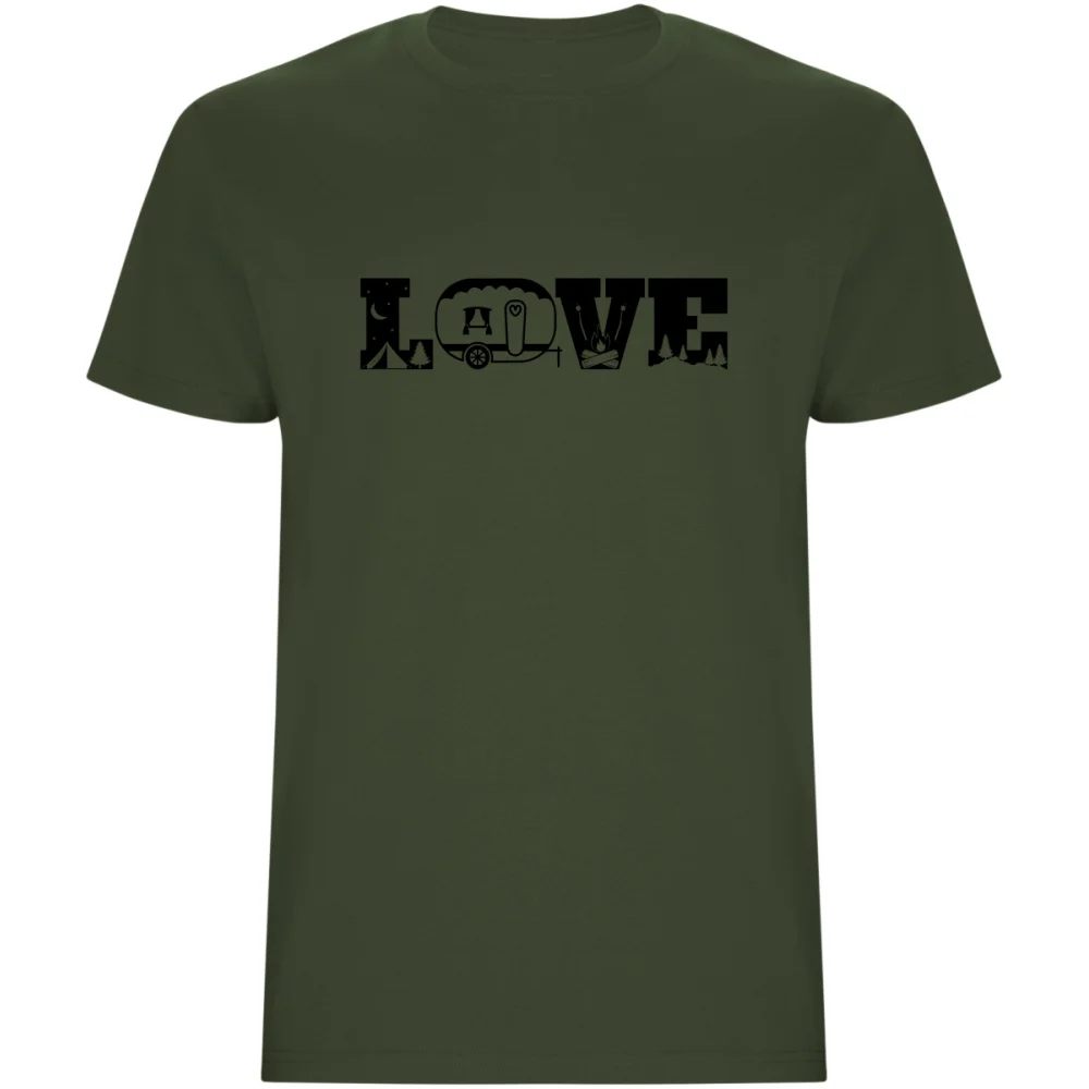 Pánské tričko "Camping Love" spojuje jednoduchý design s promyšleným detailem – originální nápis, ve kterém jsou písmena vytvořena nebo doplněna obrázky z kempování (např. stan, lucerna, táborák, hory).
