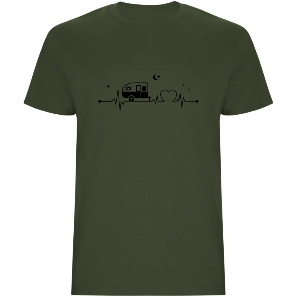 Pánské tričko s motivem EKG křivky, do které je zakomponován karavan, symbolizuje vášeň pro karavaning a nezávislé cestování. Je ideální jak na výlety, dovolenou s obytným vozem, tak i na běžné nošení.