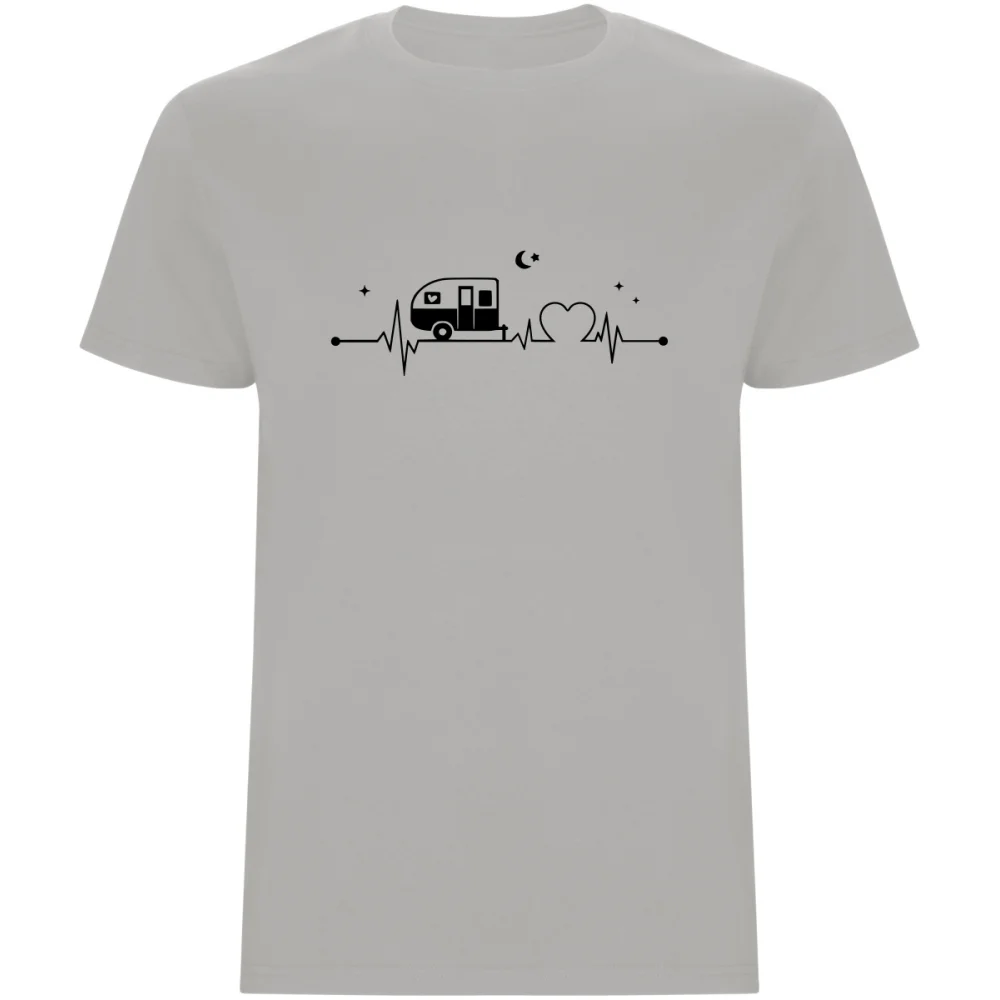 Pánské tričko s motivem EKG křivky, do které je zakomponován karavan, symbolizuje vášeň pro karavaning a nezávislé cestování. Je ideální jak na výlety, dovolenou s obytným vozem, tak i na běžné nošení.