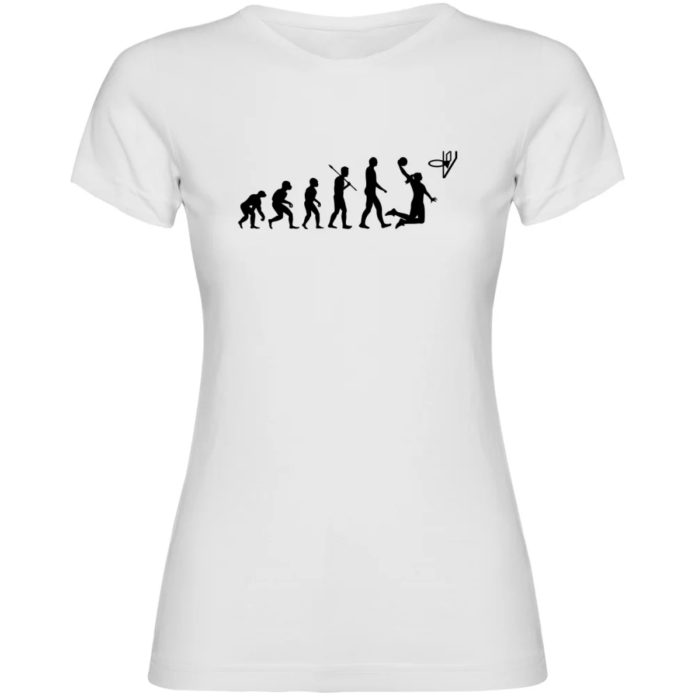 Dámské tričko s motivem evoluce basketbalistky stylově zobrazuje vývoj od prvních kroků lidstva až po dynamickou hráčku uprostřed hry.