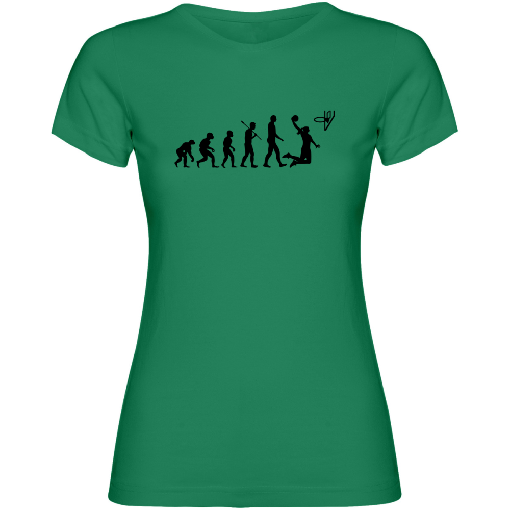 Dámské tričko s motivem evoluce basketbalistky stylově zobrazuje vývoj od prvních kroků lidstva až po dynamickou hráčku uprostřed hry.