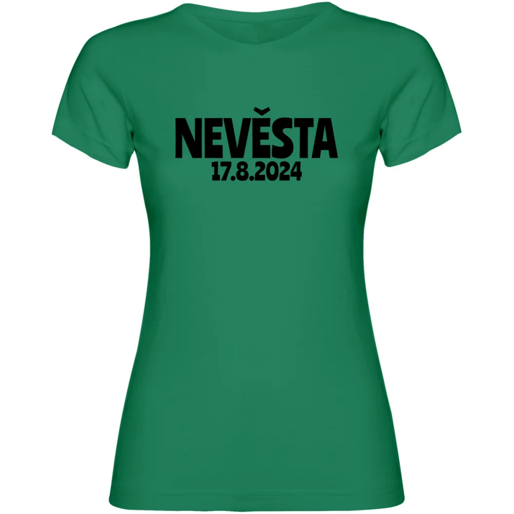 Nezapomeňte vlastní text uložit stisknutím tlačítka ULOŽIT VLASTNÍ TEXTOriginální tričko NEVĚSTA s vlastním datem svatby je ideální kousek na rozlučku se svobodou, svatební focení i dny plné příprav. Vlastní datum dává tričku osobní kouzlo a připomene ti ten jedinečný den pokaždé, když ho oblékneš. Kvalitní bavlna, pohodlný dámský střih a potisk, který jen tak nevybledne – zkrátka tričko, které ti bude dělat radost ještě dlouho po svatbě.