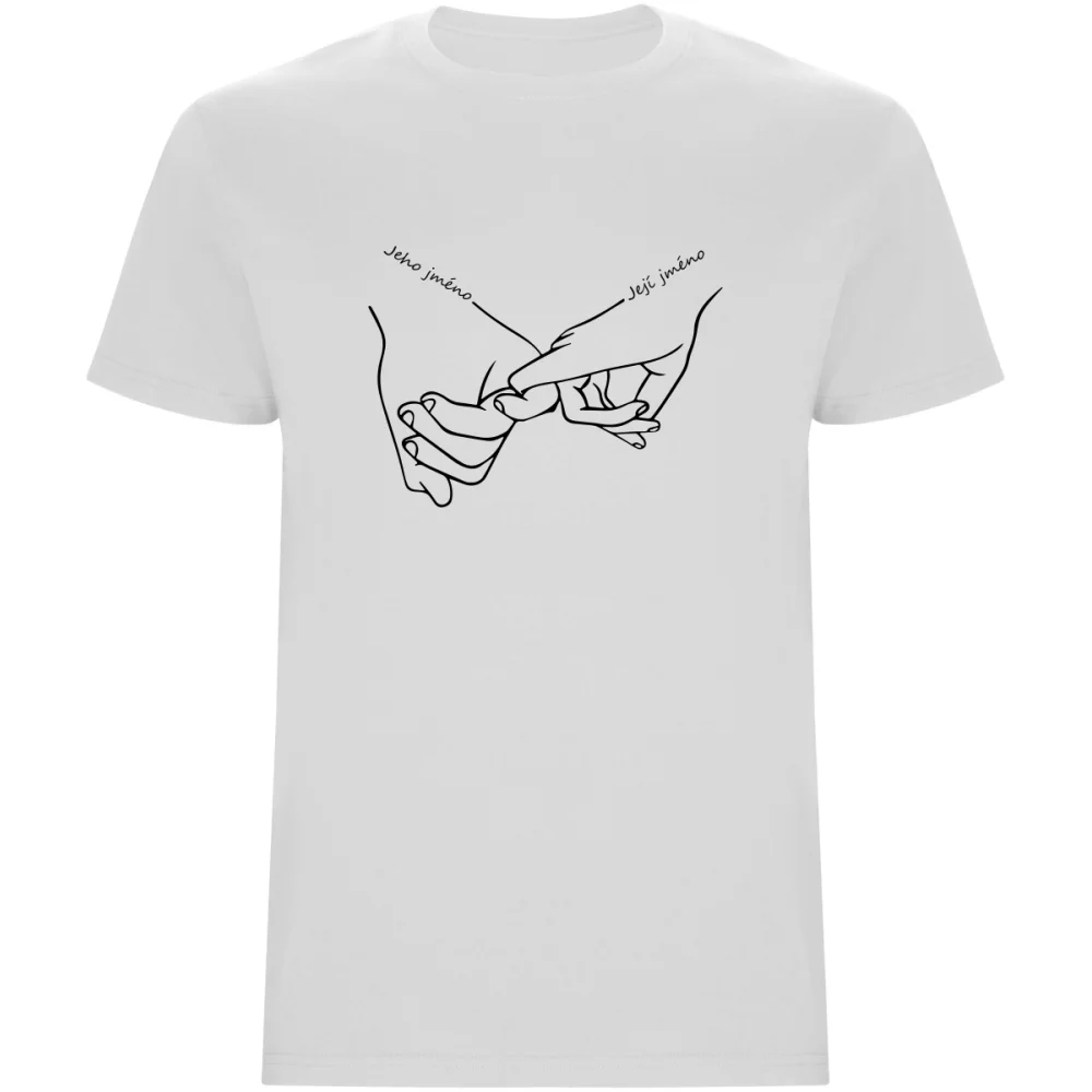 Nezapomeňte vlastní text uložit stisknutím tlačítka ULOŽIT VLASTNÍ TEXTVyjádřete svou lásku a jedinečné pouto s tímto romantickým tričkem, které zdobí motiv rukou držících se za malíček. Díky možnosti personalizace si na tričko můžete nechat přidat vaše jména a vytvořit tak originální a osobní kousek. Tričko je perfektní dárek pro ženicha, na rozlučku se svobodou nebo jako speciální překvapení pro výročí. Kvalitní DTF potisk a pohodlný střih jsou samozřejmostí. Potištěno v České republice.