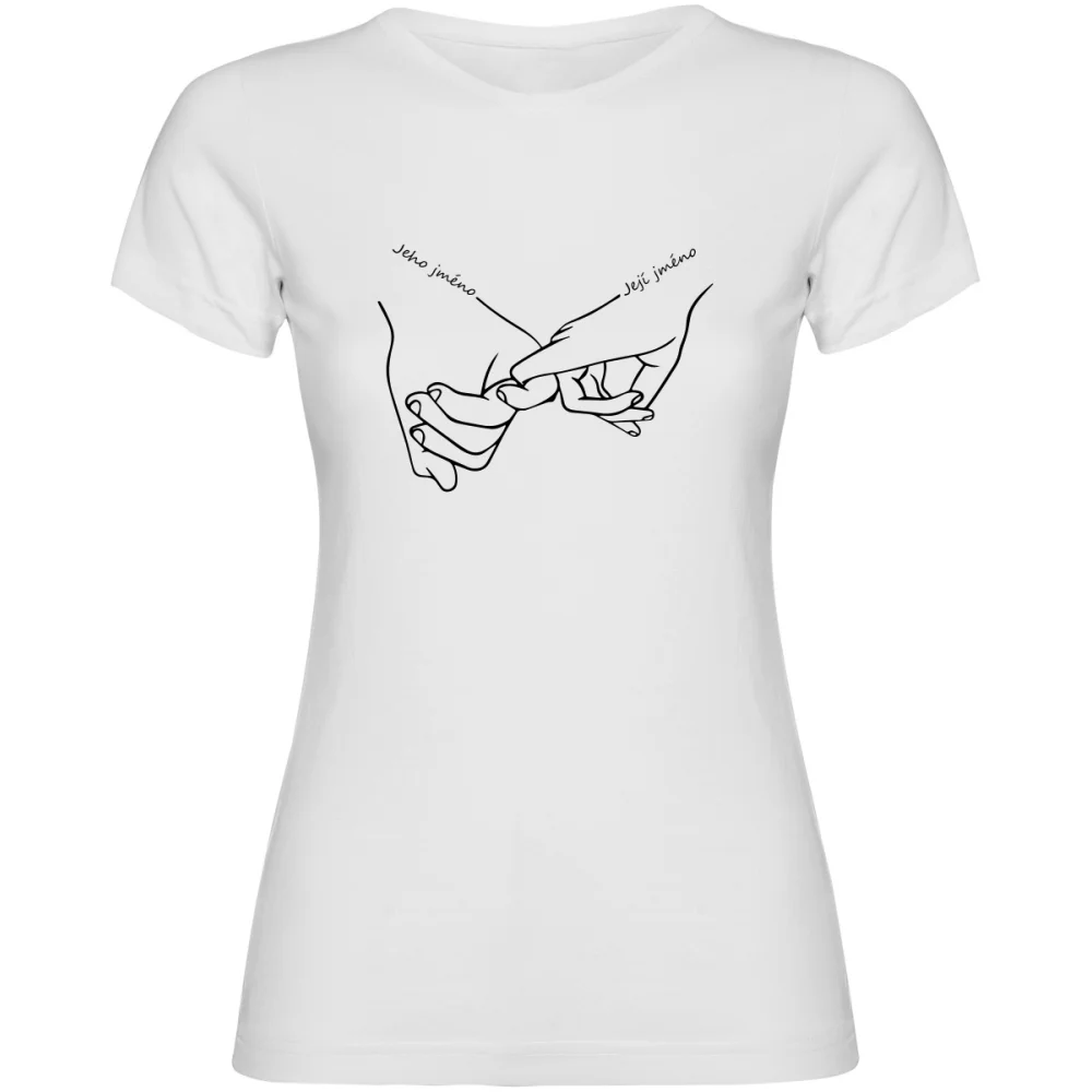 Nezapomeňte vlastní text uložit stisknutím tlačítka ULOŽIT VLASTNÍ TEXTVyjádřete svou lásku a jedinečné pouto s tímto romantickým tričkem, které zdobí motiv rukou držících se za malíček. Díky možnosti personalizace si na tričko můžete nechat přidat vaše jména a vytvořit tak originální a osobní kousek. Tričko je perfektní dárek pro nevěstu, na rozlučku se svobodou nebo jako romantické překvapení. Kvalitní DTF potisk a pohodlný střih jsou samozřejmostí. Potištěno v České republice.