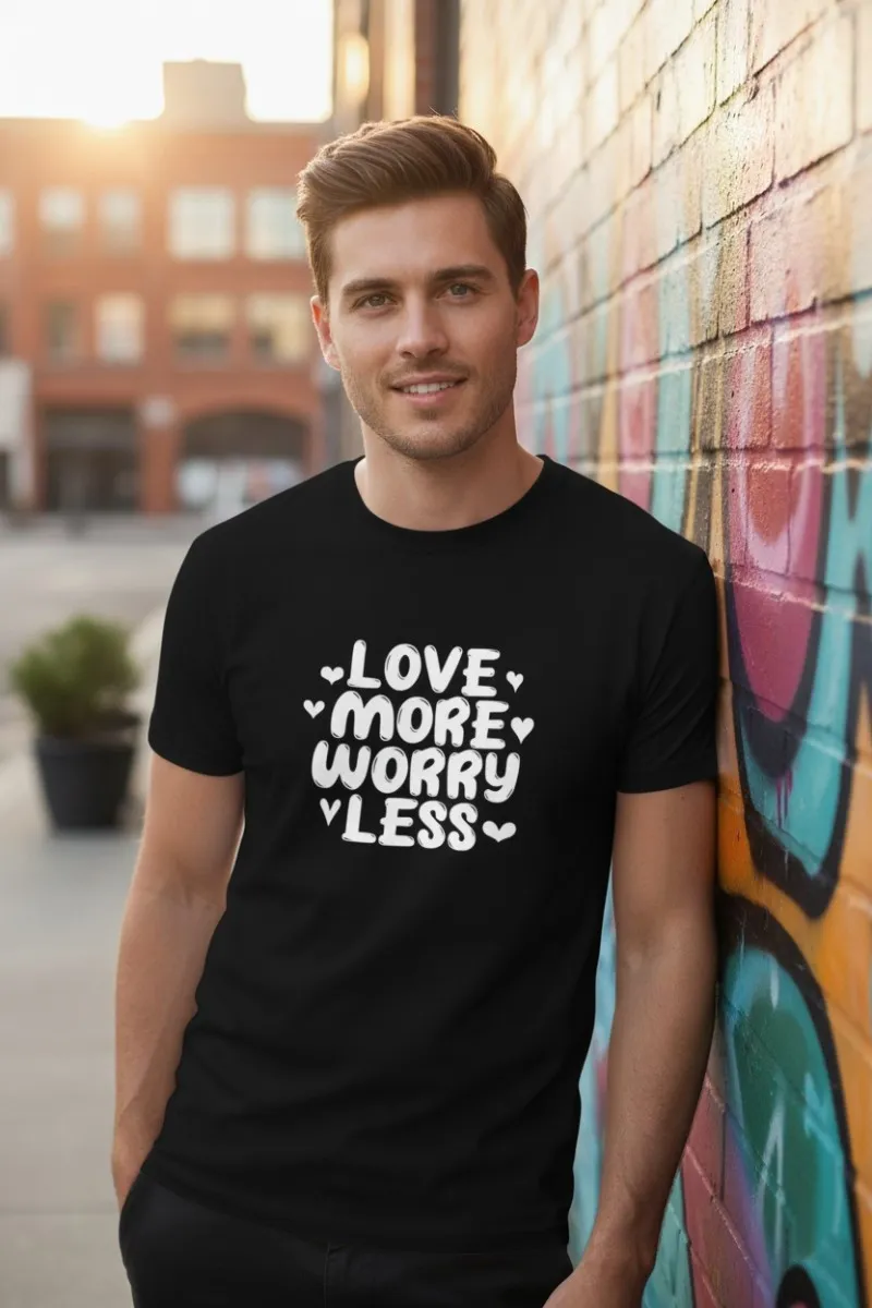 Toto pánské tričko s nápisem LOVE MORE WORRY LESS a srdíčky je pro muže s pozitivním přístupem k životu a ty, kteří se nebojí vyjádřit svou lásku a optimismus. Je to kousek, který okamžitě zlepší náladu a symbolizuje svobodu žít bez zbytečných starostí. Kvalitní potisk zajišťuje, že nápis zůstane sytý i po mnoha úsměvech. Univerzální střih skvěle sedí většině postav a je ideální na každodenní nošení i jako originální dárek. Tričko je potištěno v České republice.