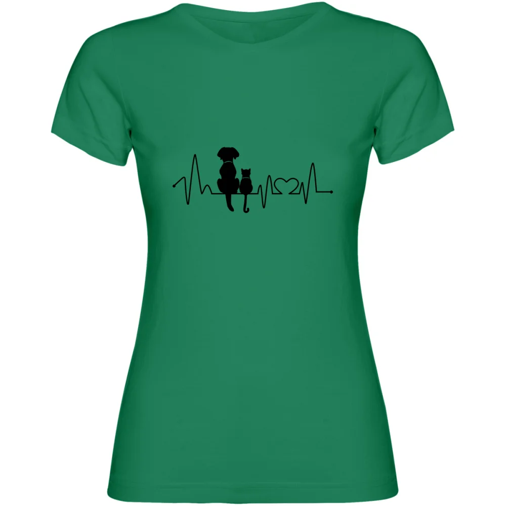 Dámské tričko – KOČKA A PES EKG je must-have pro všechny milovnice čtyřnohých přátel. Kombinace EKG křivky a siluet psa i kočky vyjadřuje silné pouto ke zvířatům – bez ohledu na to, jestli máš doma vrnící šelmu, věrného parťáka, nebo oba!