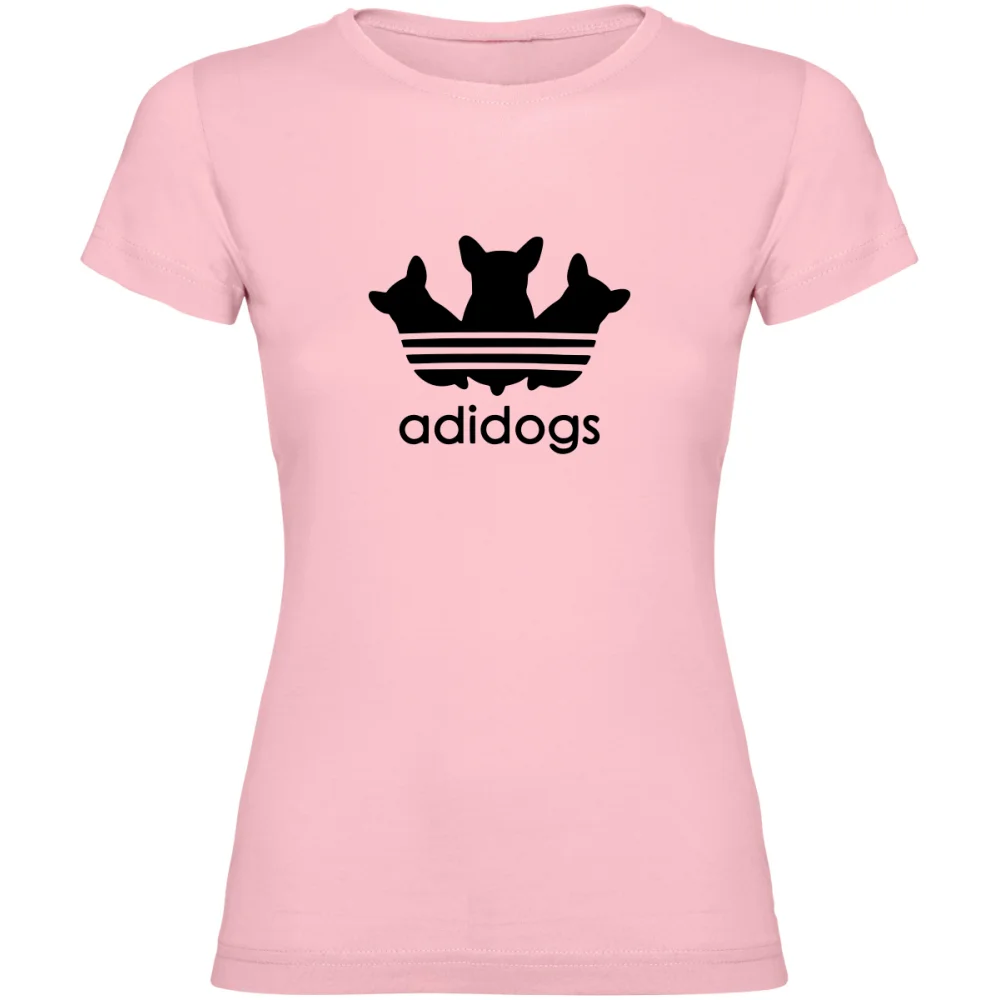 Dámské tričko – ADIDOGS je ideální volba pro každou ženu, která zbožňuje psy a zároveň má vkus. Parodie na slavnou značku dostane každou pejskařku – místo pruhů máš pejsky. Tak to má být!