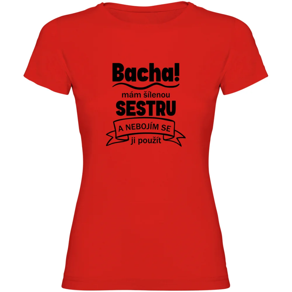 Dámské tričko „BACHA, MÁM ŠÍLENOU SESTRU“ je perfektní volba pro všechny, kdo mají doma ségru, která rozhodně nechodí po špičkách. S humorným potiskem, který jasně dává najevo, že tahle sestra je pořádná jízda, je tričko ideální pro každodenní nošení i jako originální dárek. Pohodlný střih a kvalitní materiál zajistí, že se v něm budeš cítit skvěle a zároveň pobavíš okolí.