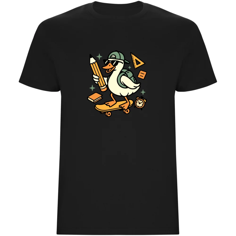 Vtipné dětské tričko s kačerem na skateboardu a školními motivy potěší každého malého školáka. Skvělé do školy i na ven, pohodlné a originální.
