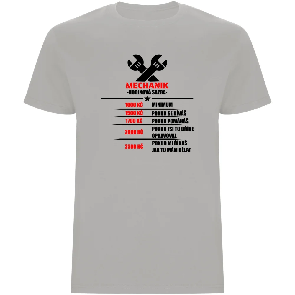 Pánské tričko s potiskem „Mechanik hodinová sazba“ je perfektní volbou pro opraváře a kutily, kteří si váží svého času i práce.