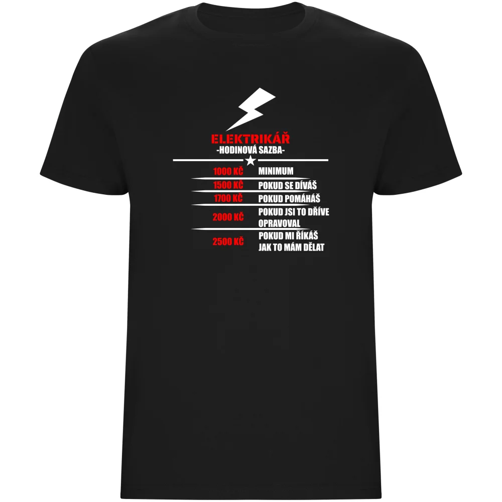 Pánské tričko s potiskem „Elektrikář hodinová sazba“ je ideální volbou pro všechny elektrikáře, kteří si váží svého času a umí to dát najevo s humorem.