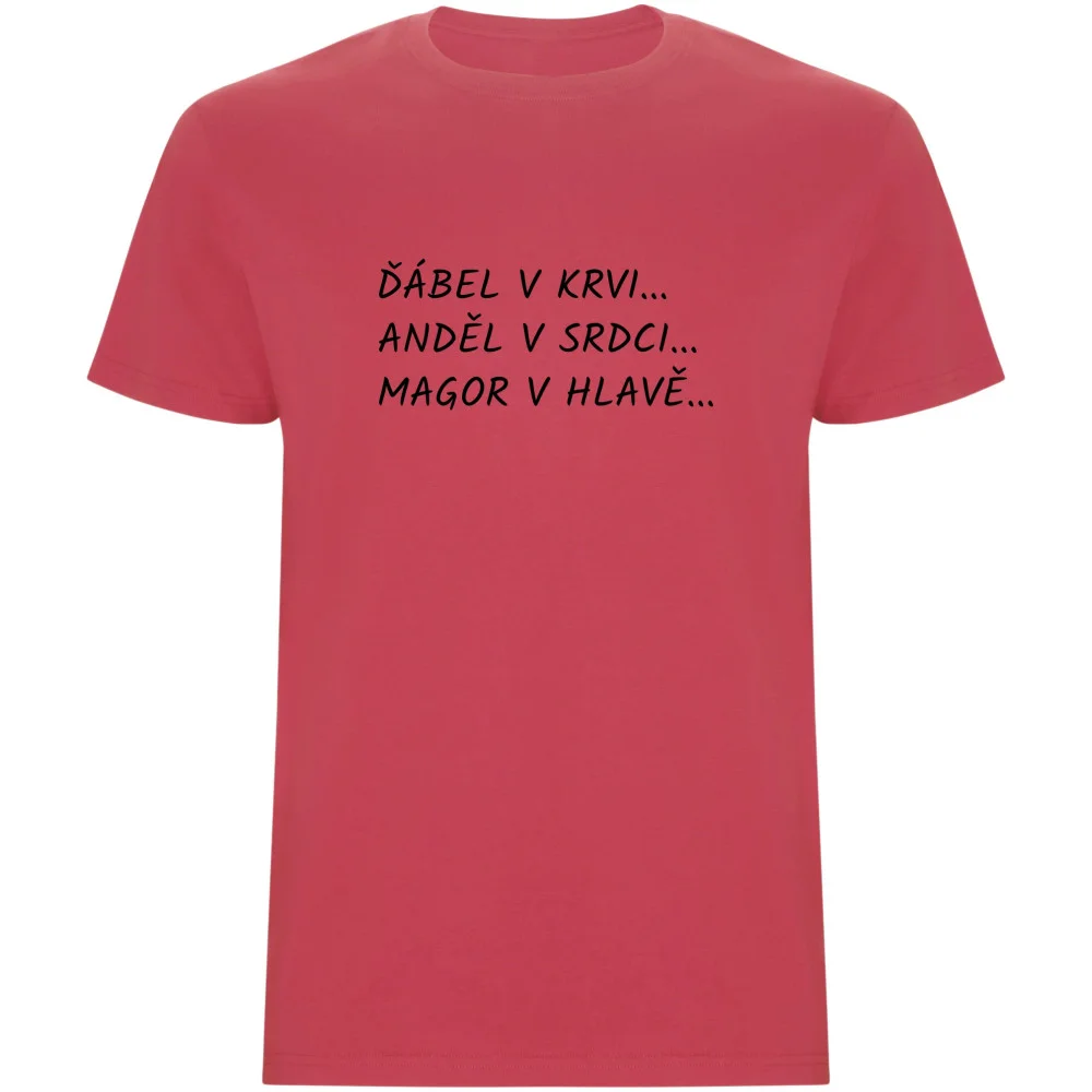 Pánské tričko s potiskem „Ďábel v krvi, anděl v srdci, magor v hlavě“ je ideální pro muže, kteří chtějí vyjádřit svou komplexní povahu s nadsázkou a stylem.