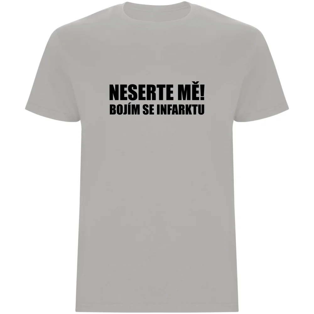 Pánské tričko s potiskem „Neserte mě, bojím se infarktu“ je ideální volbou pro muže, kteří si umí udělat srandu ze sebe i ze života.