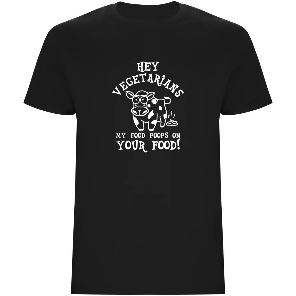Pánské tričko s originálním potiskem krávy a nápisem ‚Hey Vegetarians, My Food Poops On Your Food‘. Kvalitní bavlna, pohodlné nošení a skvělý způsob, jak vyjádřit humor každý den.