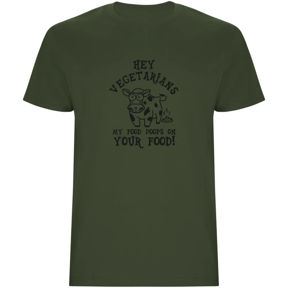 Pánské tričko s originálním potiskem krávy a nápisem ‚Hey Vegetarians, My Food Poops On Your Food‘. Kvalitní bavlna, pohodlné nošení a skvělý způsob, jak vyjádřit humor každý den.