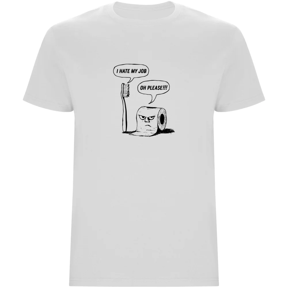 Pánské tričko s vtipným potiskem kartáčku říkajícího ‚I Hate My Job‘ a toaletního papíru odpovídajícího ‚Oh Please‘. Skvělý způsob, jak se pobavit a ukázat nadhled na běžné situace.