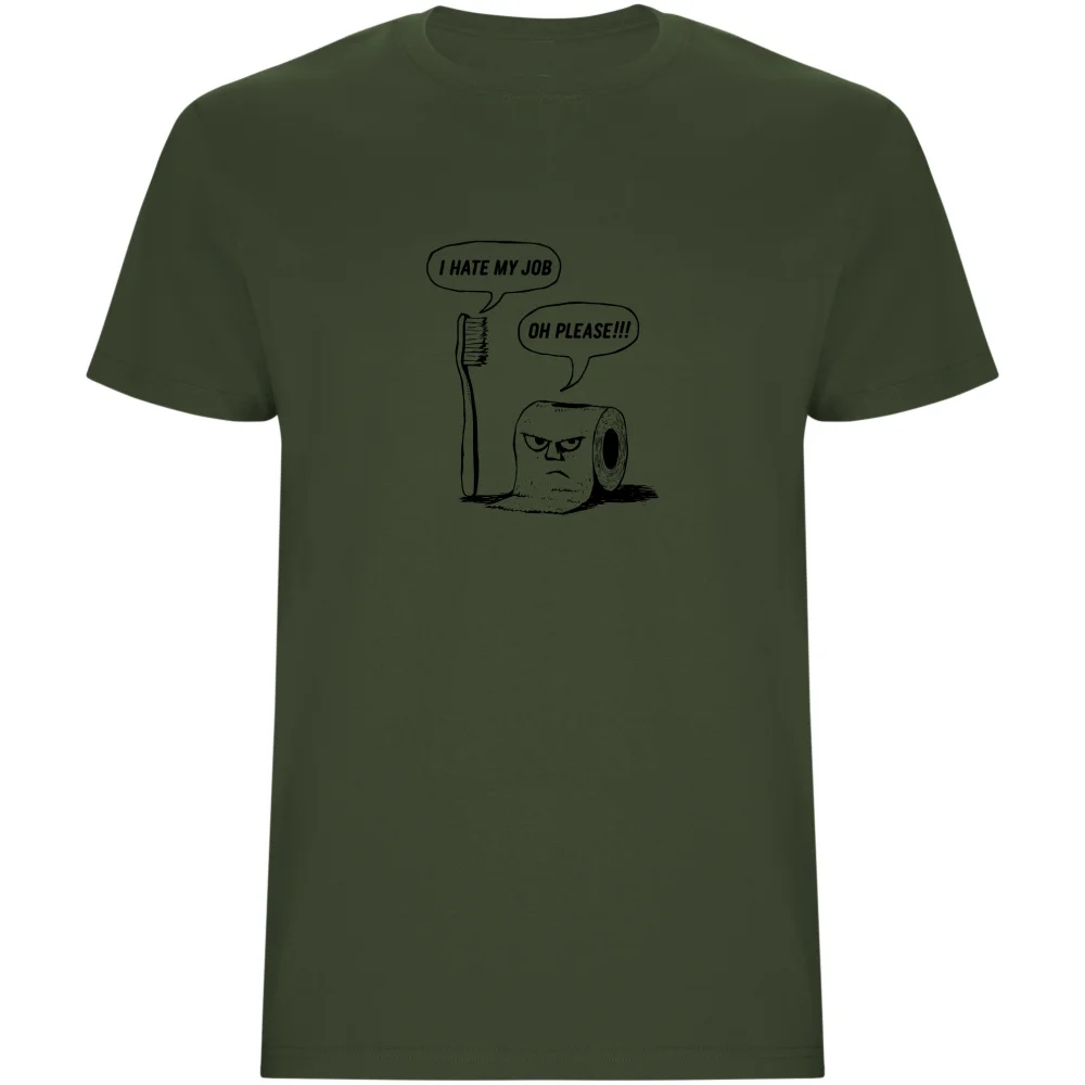 Pánské tričko s vtipným potiskem kartáčku říkajícího ‚I Hate My Job‘ a toaletního papíru odpovídajícího ‚Oh Please‘. Skvělý způsob, jak se pobavit a ukázat nadhled na běžné situace.