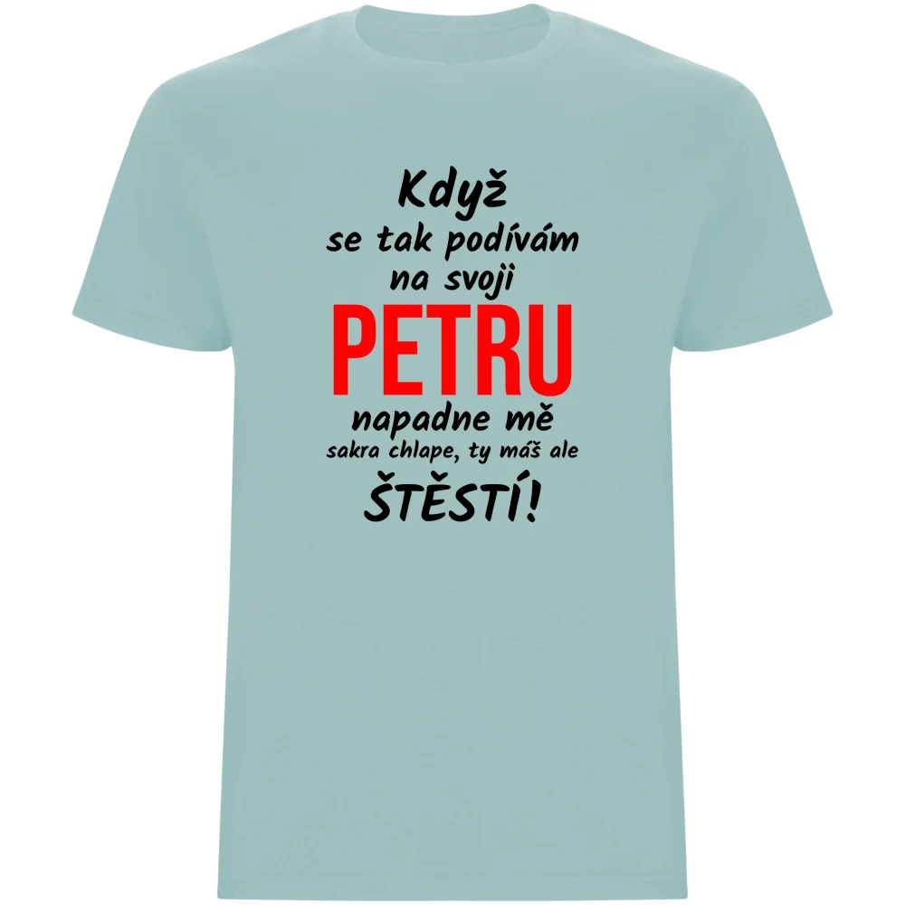 Nezapomeňte vlastní text uložit stisknutím tlačítka ULOŽIT VLASTNÍ TEXTPánské tričko s vtipným nápisem „Když se tak podívám na svoji (JMÉNO), napadne mě, sakra chlape, ty máš ale štěstí“ je skvělým originálním dárkem. Díky možnosti vložit jméno je tričko ještě osobnější a zaručeně pobaví. Vyrobeno z kvalitního materiálu s odolným potiskem, který vydrží. Perfektní jako dárek pro přítele, manžela nebo kamaráda.