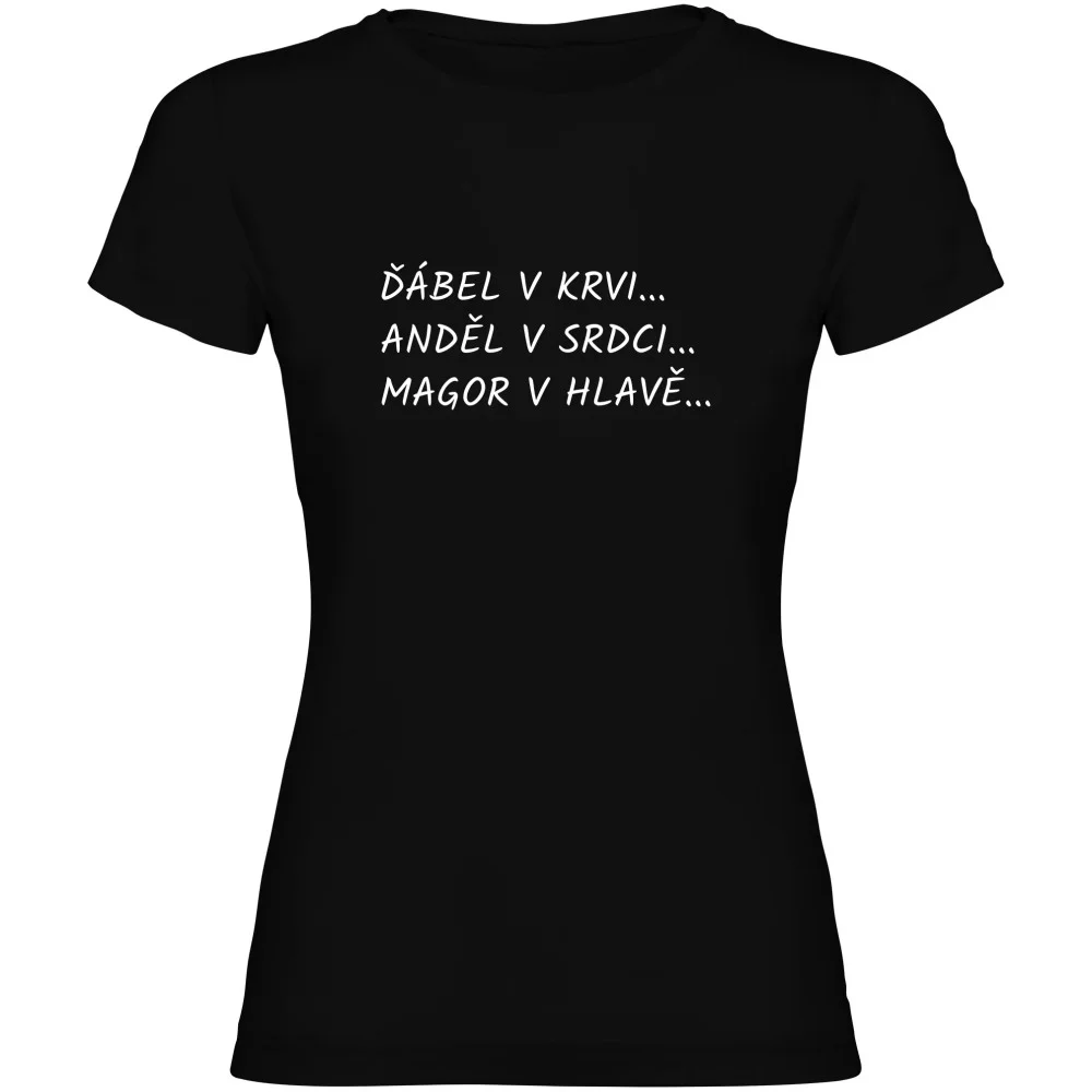 Dámské tričko s potiskem „Ďábel v krvi, anděl v srdci, magor v hlavě“ je ideálním kouskem pro každou ženu, která se nebojí být sama sebou – s energií, vášní i humorem.