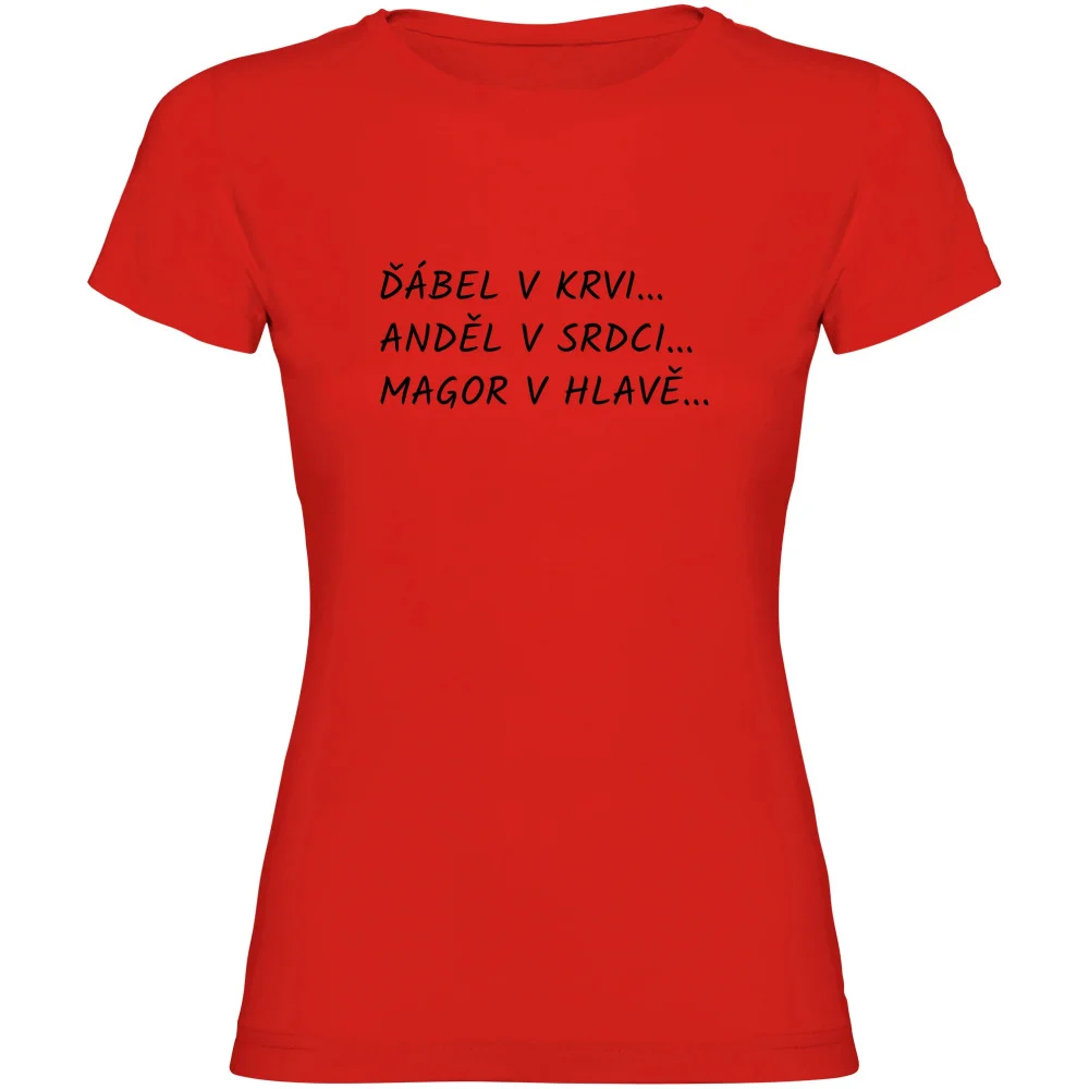 Dámské tričko s potiskem „Ďábel v krvi, anděl v srdci, magor v hlavě“ je ideálním kouskem pro každou ženu, která se nebojí být sama sebou – s energií, vášní i humorem.