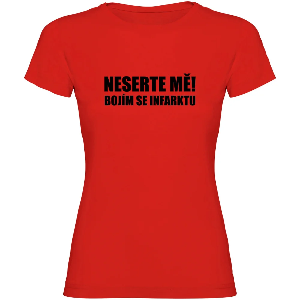 Dámské tričko s potiskem „Neserte mě, bojím se infarktu“ je ideální volbou pro ženy, které se nebojí říct, co si myslí. Výstižný nápis, který rozesměje každého – a zároveň dává jasné varování!