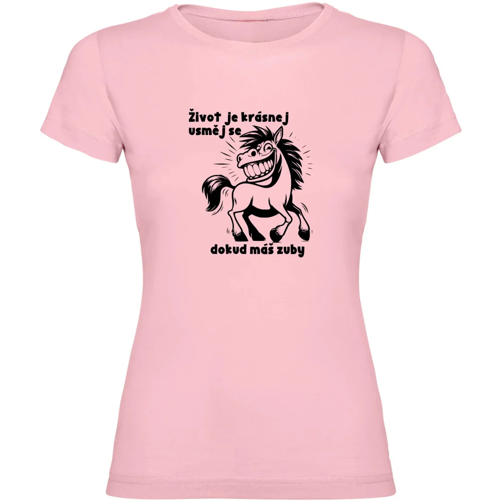 Dámské tričko s potiskem „Život je krásnej, usměj se dokud máš zuby“ je vtipný a originální kousek, který vykouzlí úsměv na tváři. Vyrobené z kvalitního a pohodlného materiálu s odolným potiskem, který vydrží i časté praní. Skvěle padne a je ideální jako dárek pro kamarádku, sestru nebo kolegyni.